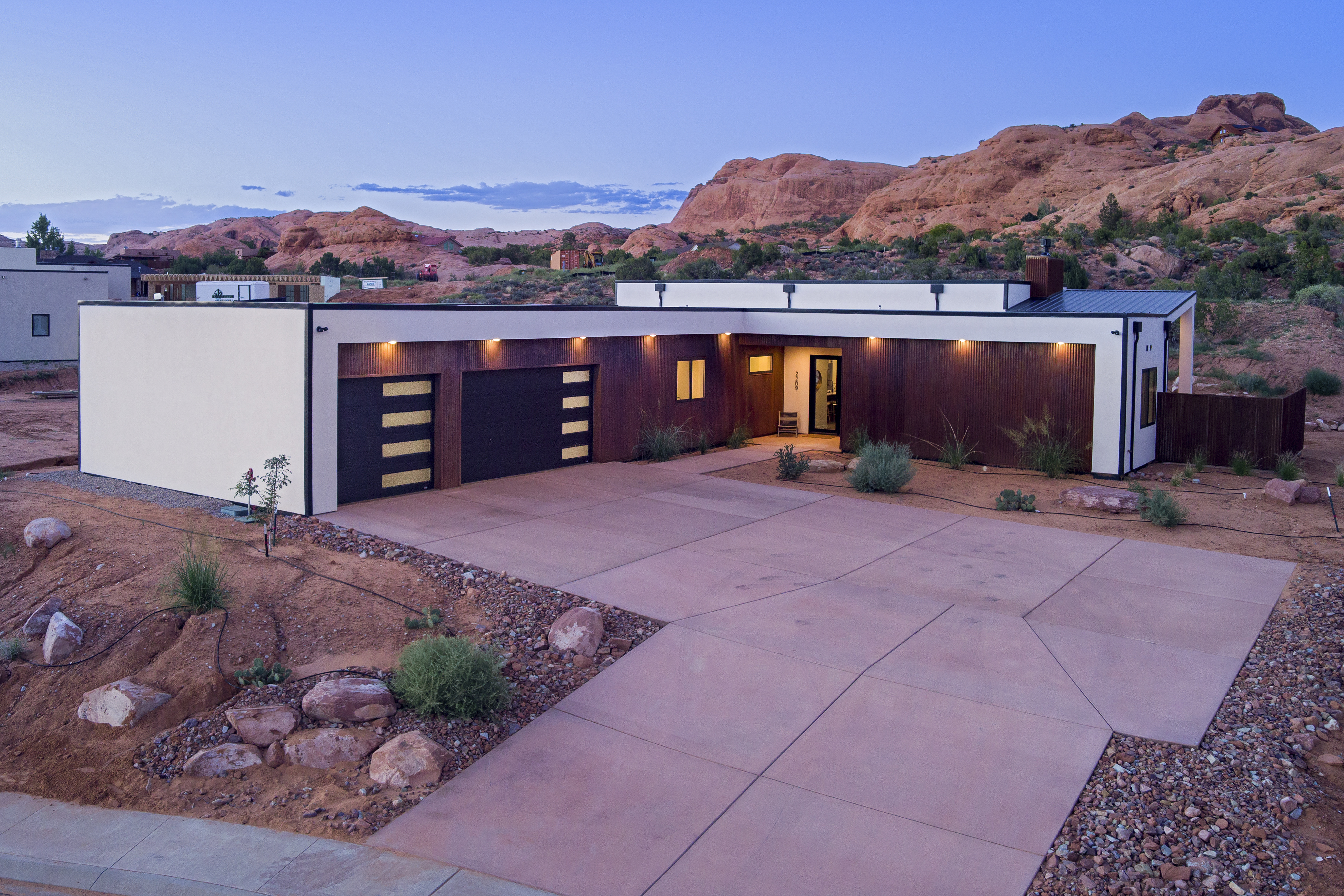 Set under the iconic Matterhorn, this contemporary beauty was meticulously designed to appease the sophisticated eye. Simple, yet elegant with seamless integration into the red rock viewscape with exceptional outdoor space. Twelve-foot ceilings throughout help enhance the architectural position of the home for maximum benefit of views. This newly constructed luxury home with superior style and superior function celebrates two master en-suites, an additional guest bedroom and bath, office, as well as an outstanding mudroom with laundry. The generous living space beckons natural light with a formal dining room, open kitchen featuring custom welded metal work, quality stainless steel appliances, quartz countertops, and island seating. Both en-suites grant dual sinks, lavish showers with glass doors, and ample closet space. Concrete floors throughout compliment the crisp, clean lines of the home and help with ease of maintenance. The attached 3 car garage will assist with keeping your vehicles cared for, with additional parking on the over-sized concrete driveway. This home is perfect for your recreational life and your love of linear design. Located near Moab's Golf Club, this marvel is within walking distance to hiking & golfing- as well easy access to world class OHV trails.
